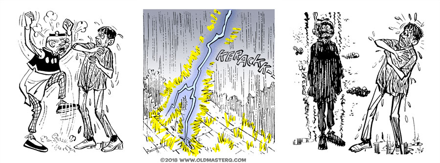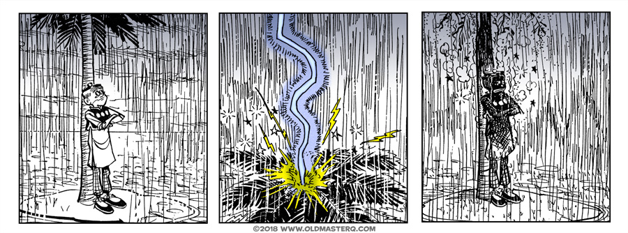 It seems the OMQ has a tendency to be struck by lightning quite a bit in the comics. But the actual odds of being struck range from about 1/700,000 to 1/500,000. Either way, please be safe during a thunderstorm and learn from Old Master Q's lessons.