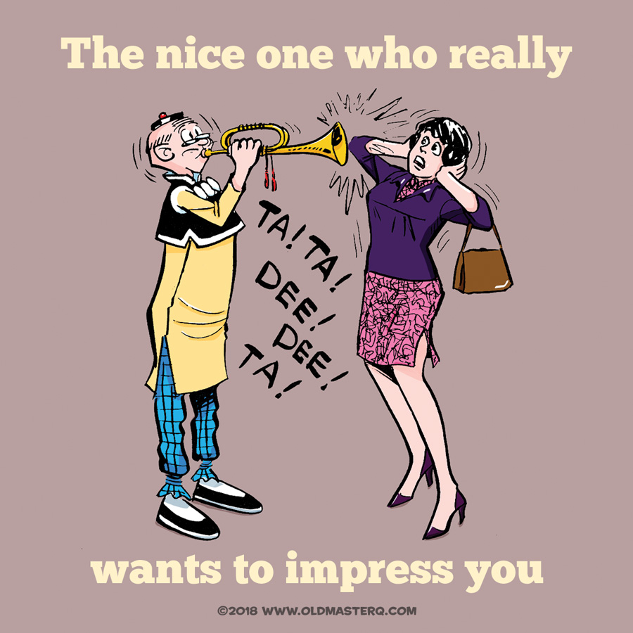OMQ might be a rock star at serenading with a guitar, but what if he only has a horn available and he's never learned to use it before? Well as a gentleman, Master Q will try his darndest master his new equipment in order to impress you! This exemplifies the kindness and determination that he has to win your heart.